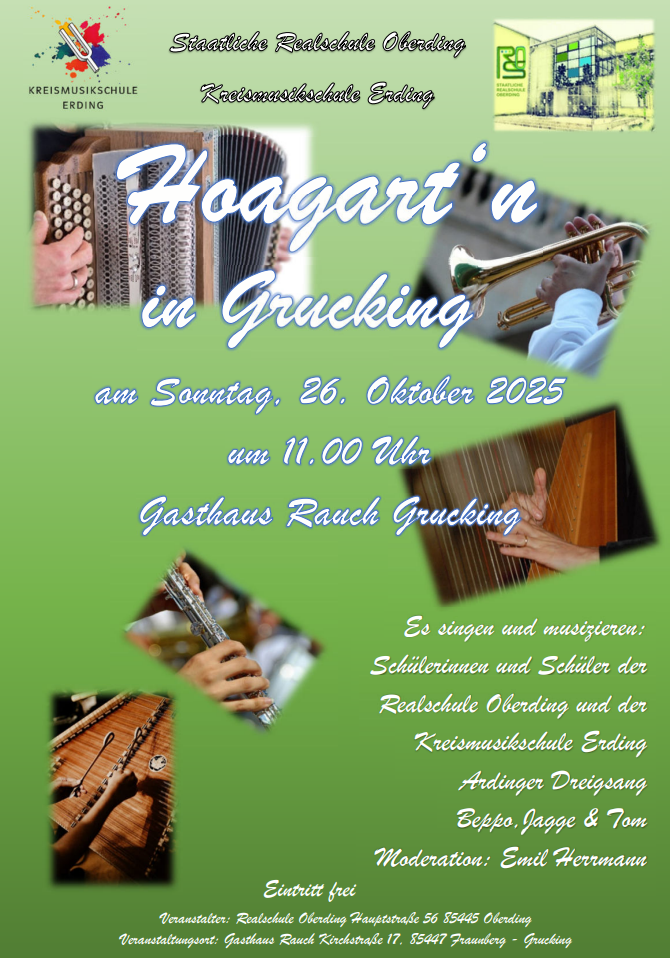 Zum dritten Mal findet für alle Freunde der bayerischen Volksmusik am Sonntag, 26. Oktober 2025 um 11:00 Uhr ein Hoagart‘n im Gasthaus Rauch in Grucking statt. Es treffen sich Schülerinnen und Schüler der Realschule Oberding (RSO) und der Kreismusikschule Erding (KMS) zum gemeinsamen Singen und Musizieren. Um den Nachwuchsmusikanten die Gelegenheit zu geben, vor Publikum in geselliger Atmosphäre zu spielen, wird dieser Hoagart‘n in einer Kooperation beider Schulen veranstaltet. Zu hören sind u.a. das Hackbrett-Trio Viktoria Reiter, Ursula Beibl und Lucia Metz, das Harfentrio Lili Dukkon, Helene Hörmann und Maria Schirmer, die Ziachmusi der Kreismusikschule, das Flötenduo Nicola Piepersberg und Sabine Waritschlager der RSO, Lukas Vollmer am Akkordeon sowie das Trompeten-Duo Jakob und Leonhard aus Dorfen. Als besondere Gäste sind auch dieses Jahr der Ardinger Dreigsang und das jugendlich frische Volksmusik-Trio „Beppo, Jagge & Tom“ mit von der Partie. Durch das Programm führt Emil Herrmann. Der Eintritt ist frei.