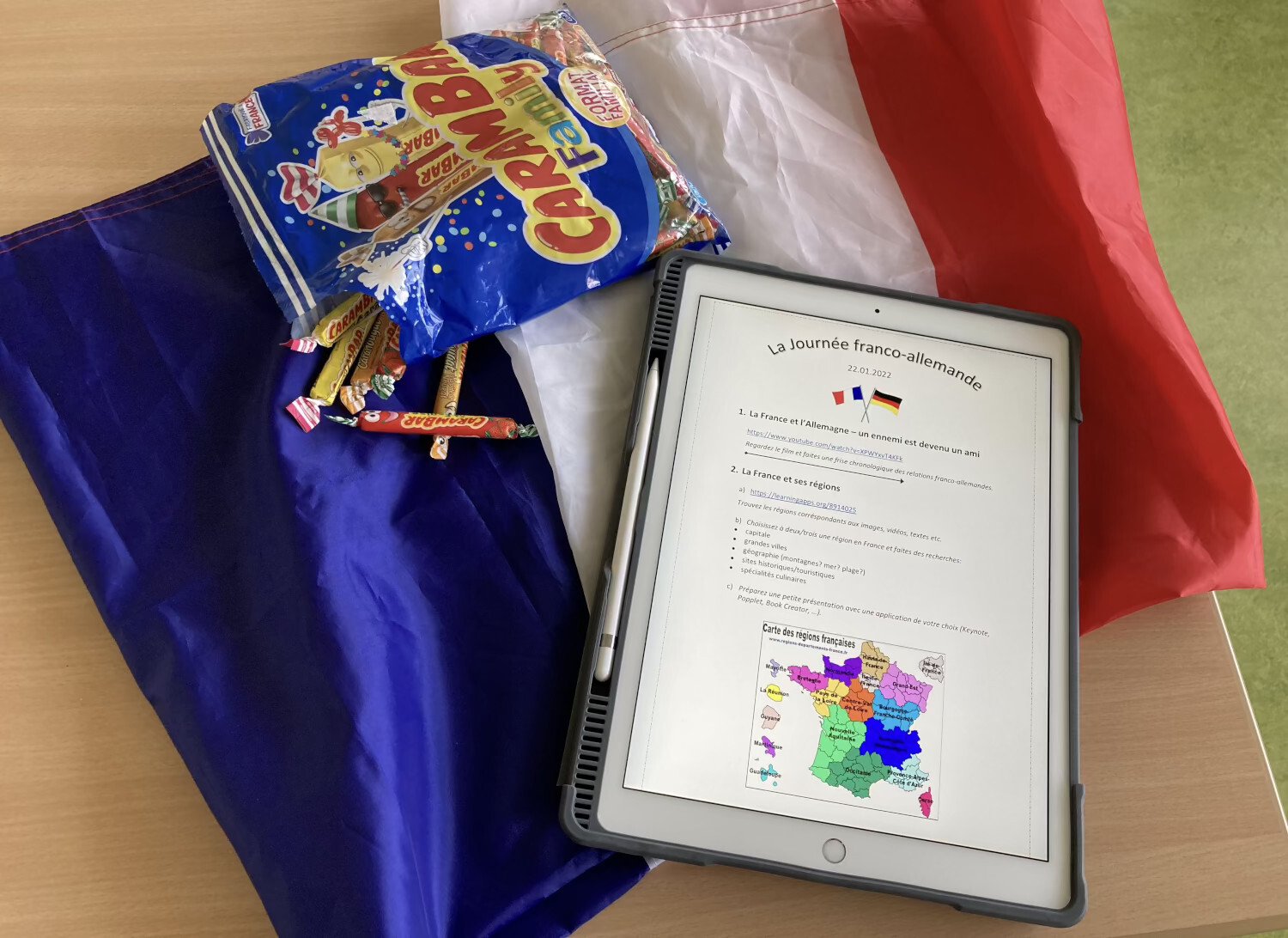 Anlässlich des Deutsch-Französischen Tags am 22. Januar, der in Erinnerung an die Unterzeichnung des Elysée-Vertrags 1963 gefeiert wird, befasste sich der Französischzweig der 9a Ende Januar mit der Geschichte der deutsch-französischen Beziehungen. Außerdem absolvierten die Schülerinnen und Schüler ein interaktives Quiz zu den französischen Regionen und erstellten in Gruppen Präsentationen zu einer Region ihrer Wahl. So begab sich die Klasse auf gedankliche Reisen an die Côte d’Azur, durch Okzitanien und in die Bretagne. Sprachlich besonders anspruchsvoll gestaltete sich die Analyse von Witzen, die sich in den Verpackungen der französischen Kultsüßigkeit Carambar verstecken.