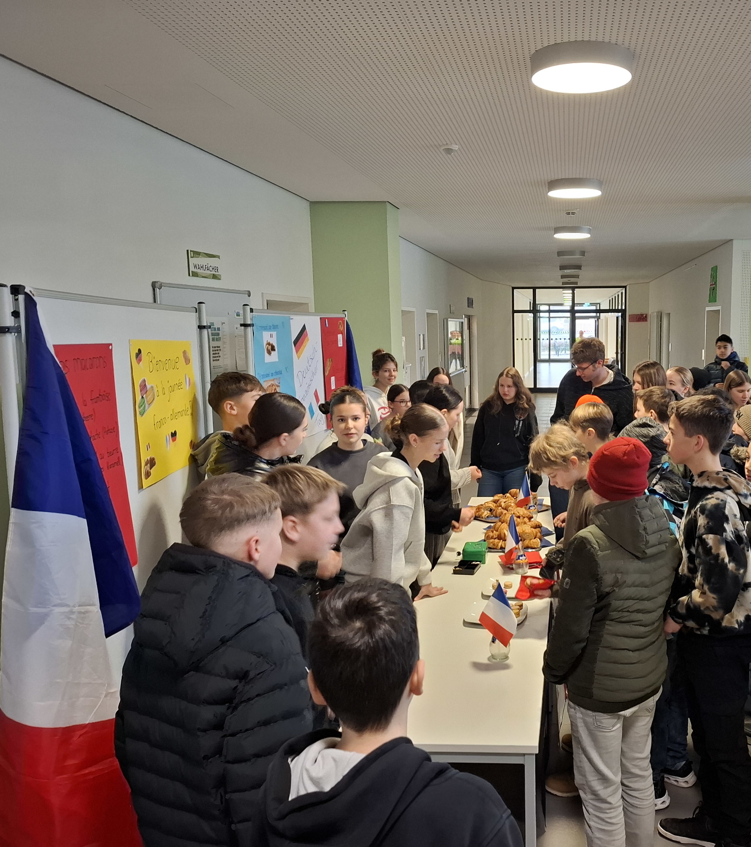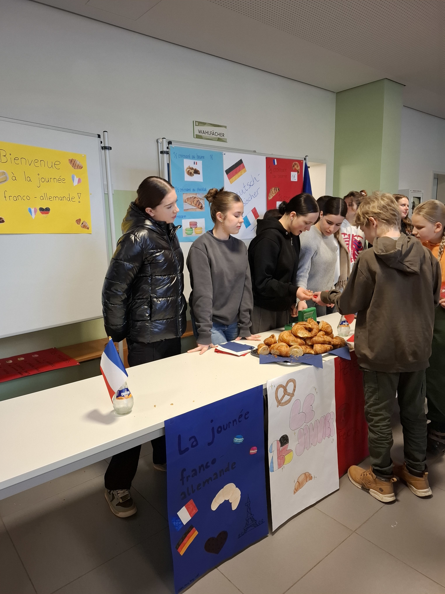 Unter diesem Motto erstrahlte die Aula unserer Schule am 22. Januar 2025 in blau – weiß – rot, den Farben der französischen Nationalflagge. Aus den Lautsprecherboxen erklang französische Musik und die Französischschülerinnen und -schüler der Klassen 8c und 9c verkauften mit großem Engagement Croissants und Macarons. Der Ansturm auf die französischen Leckereien war riesig und auch das Zuordnungsspiel mit französischen und deutschen Pendants erfreute sich großem Interesse. Wir feierten einen Tag, an den es sich jedes Jahr zu erinnern lohnt: