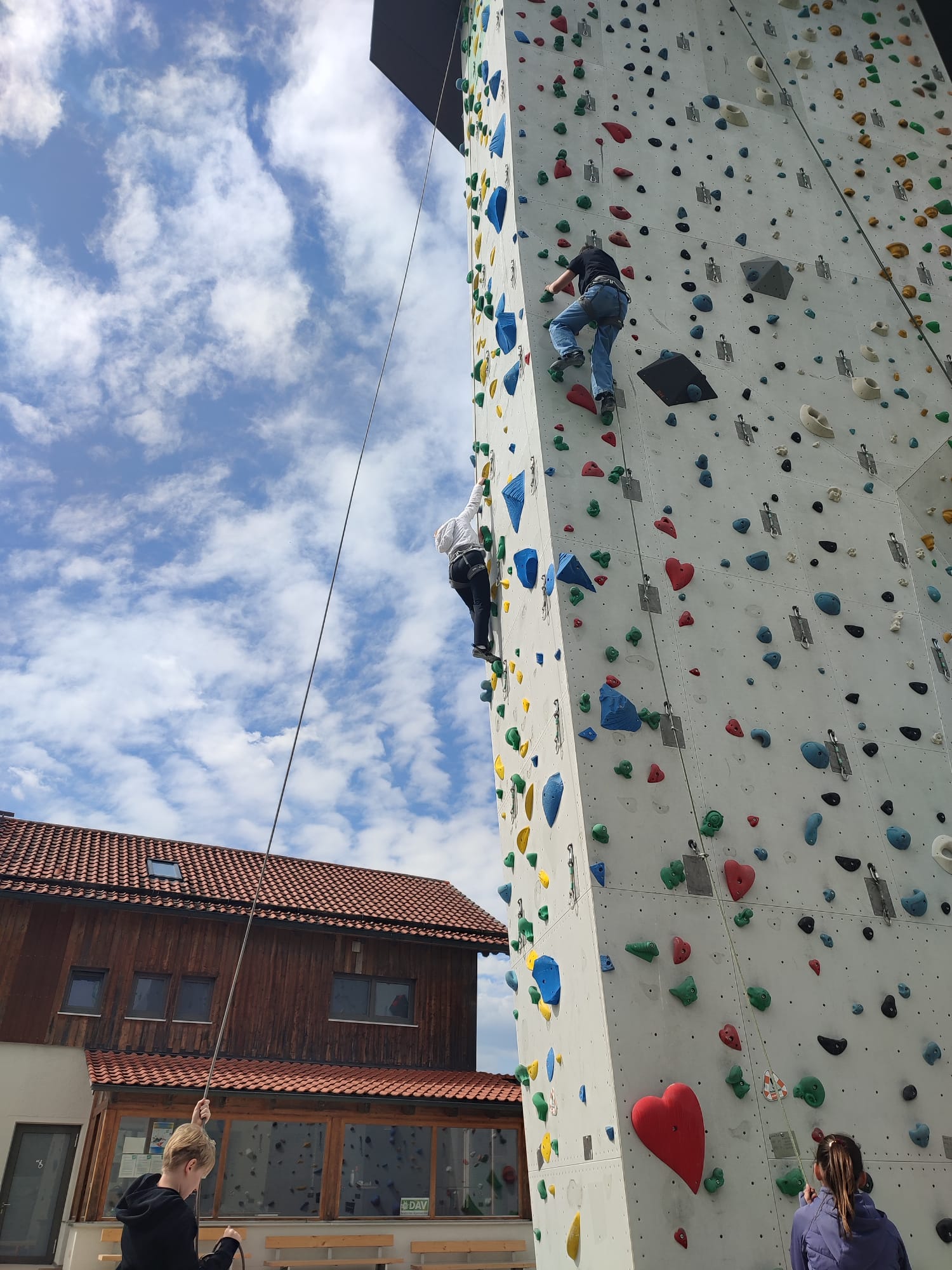 Das Wahlfach Klettern findet in den wärmeren Monaten, meist von September bis Allerheiligen und ab Ostern bis Schuljahresende, an der Kletterwand des DAV Erding am Kronthaler Weiher im Freien statt. Die Schülerinnen und Schüler üben unter der Leitung von Frau Hollerith, im Team zu arbeiten und Verantwortung für sich und andere Menschen zu übernehmen. Sie lernen neben den Klettertechniken auch das richtige Einbinden mit dem doppelten Achterknoten und das Sichern mit halbautomatischen Sicherungsgeräten.