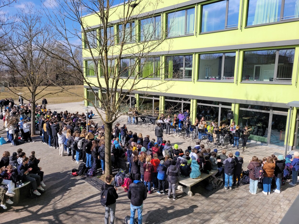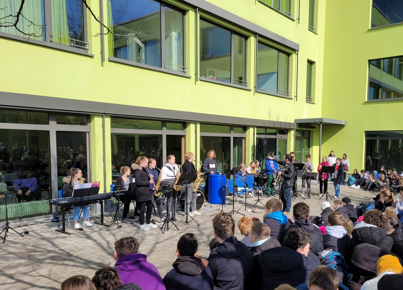 Im März stand auf dem Stundenplan der Bläserklasse 6a und der Talentklassen 7-10 ein ganz besonderes Fach: Musik mit Jörg Hartl, Trompeter von LaBrassBanda, und das den ganzen Vormittag.