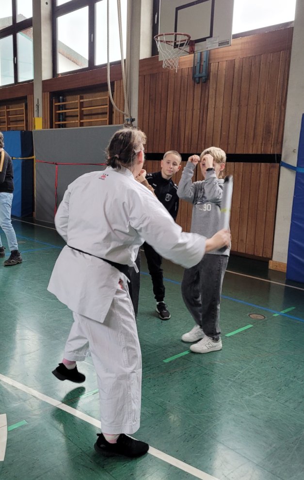 Der Kurs, der dankenswerterweise durch den Förderverein der Realschule ermöglicht wurde, sollte zudem auf wichtige Punkte im Falle einer Gefährdungssituation aufmerksam machen: So sollten vor allem abends geeignete Strecken entsprechend gewählt und Leute gezielt angesprochen werden, um in einer Gefahrensituation lautstark auf sich aufmerksam zu machen. Aufmerksamkeit gelte als erste Form der Selbstverteidigung, gefolgt von Flucht und schließlich dem Kampf als letzte Möglich-keit. Die Kursleiterinnen klärten zudem über eine selbstbewusste Körpersprache auf und ermahn-ten die Teilnehmenden vor allem zur Aufmerksamkeit, die eben nicht nur auf das Smartphone gerichtet sein soll.