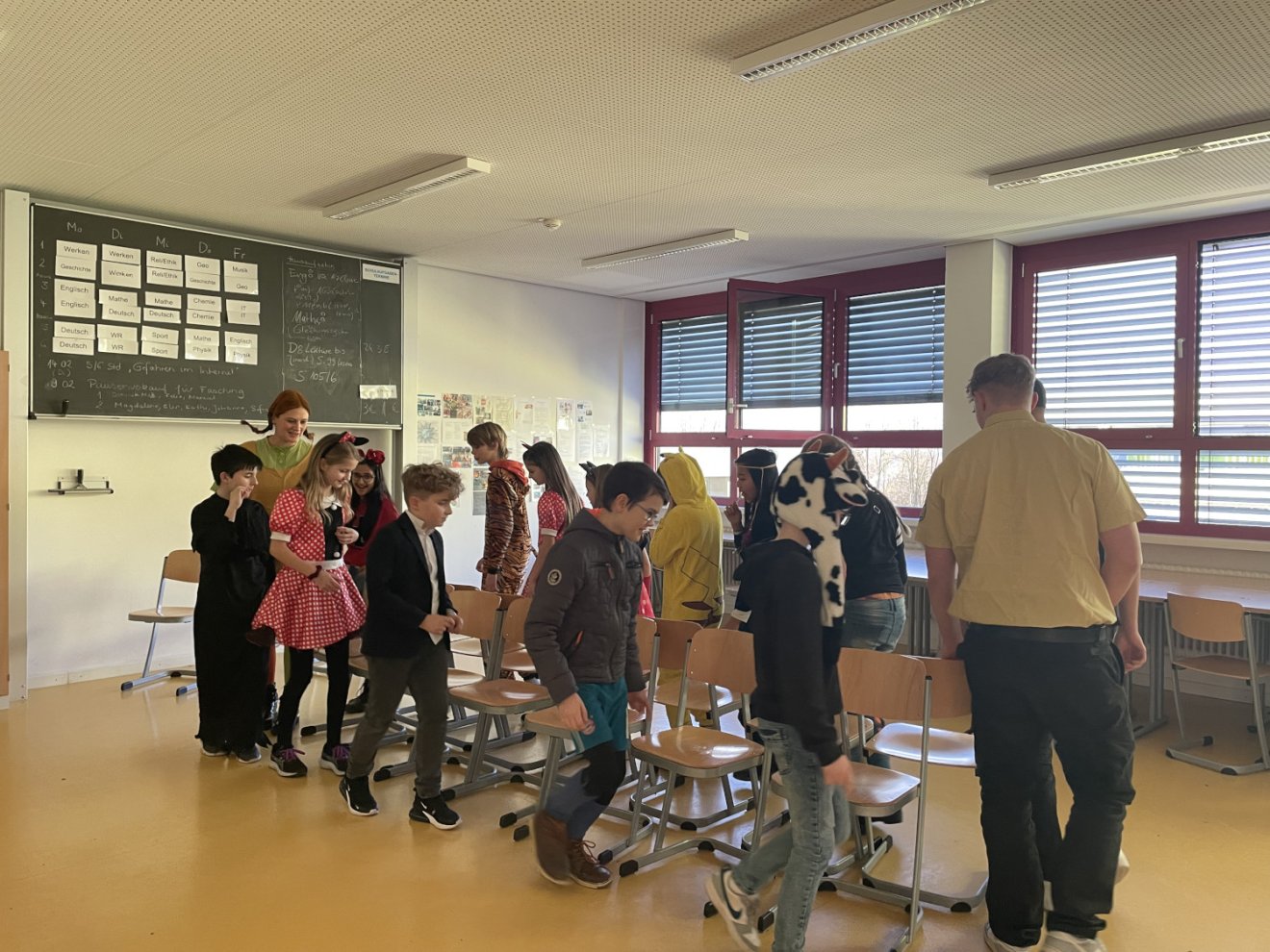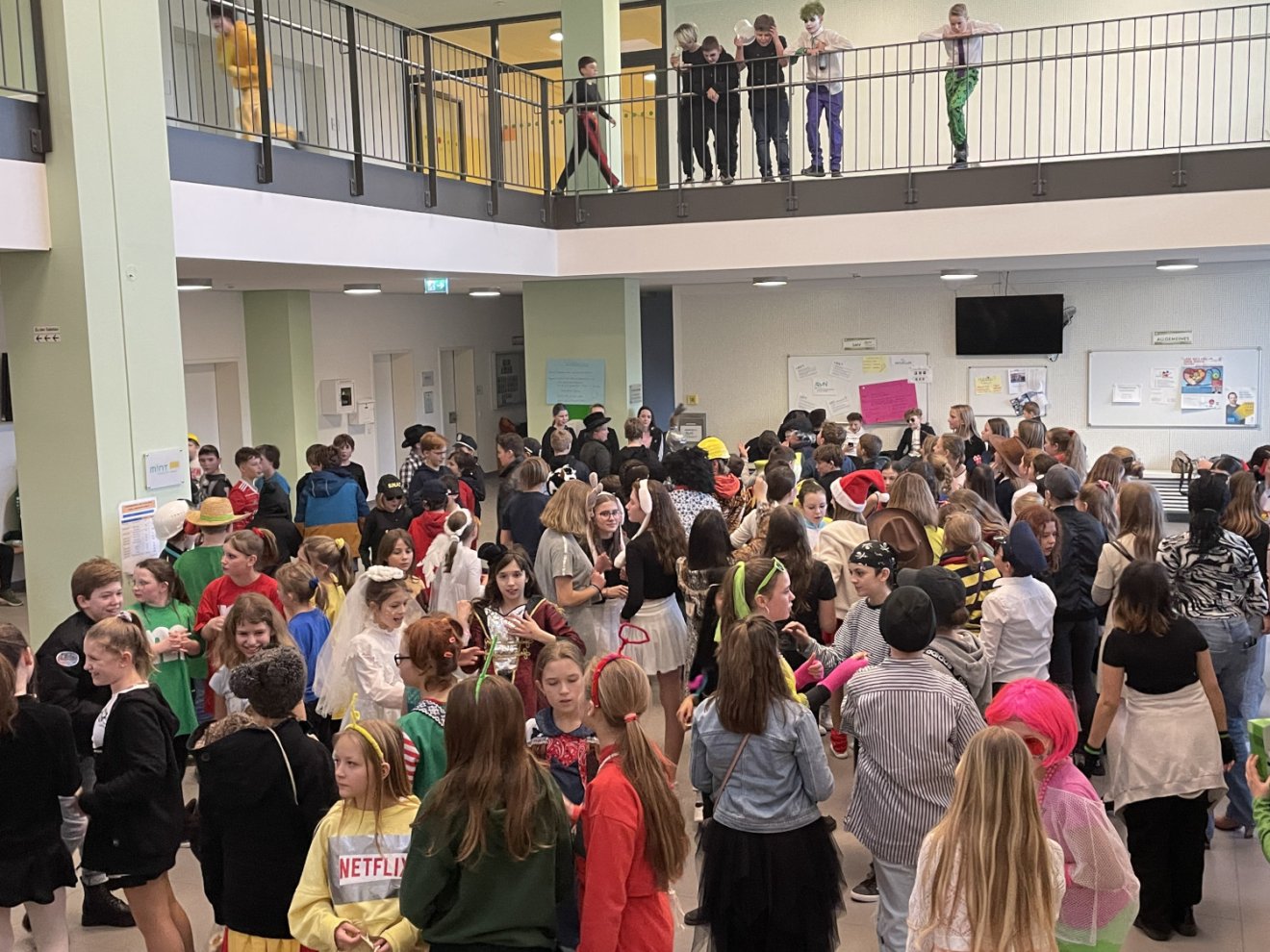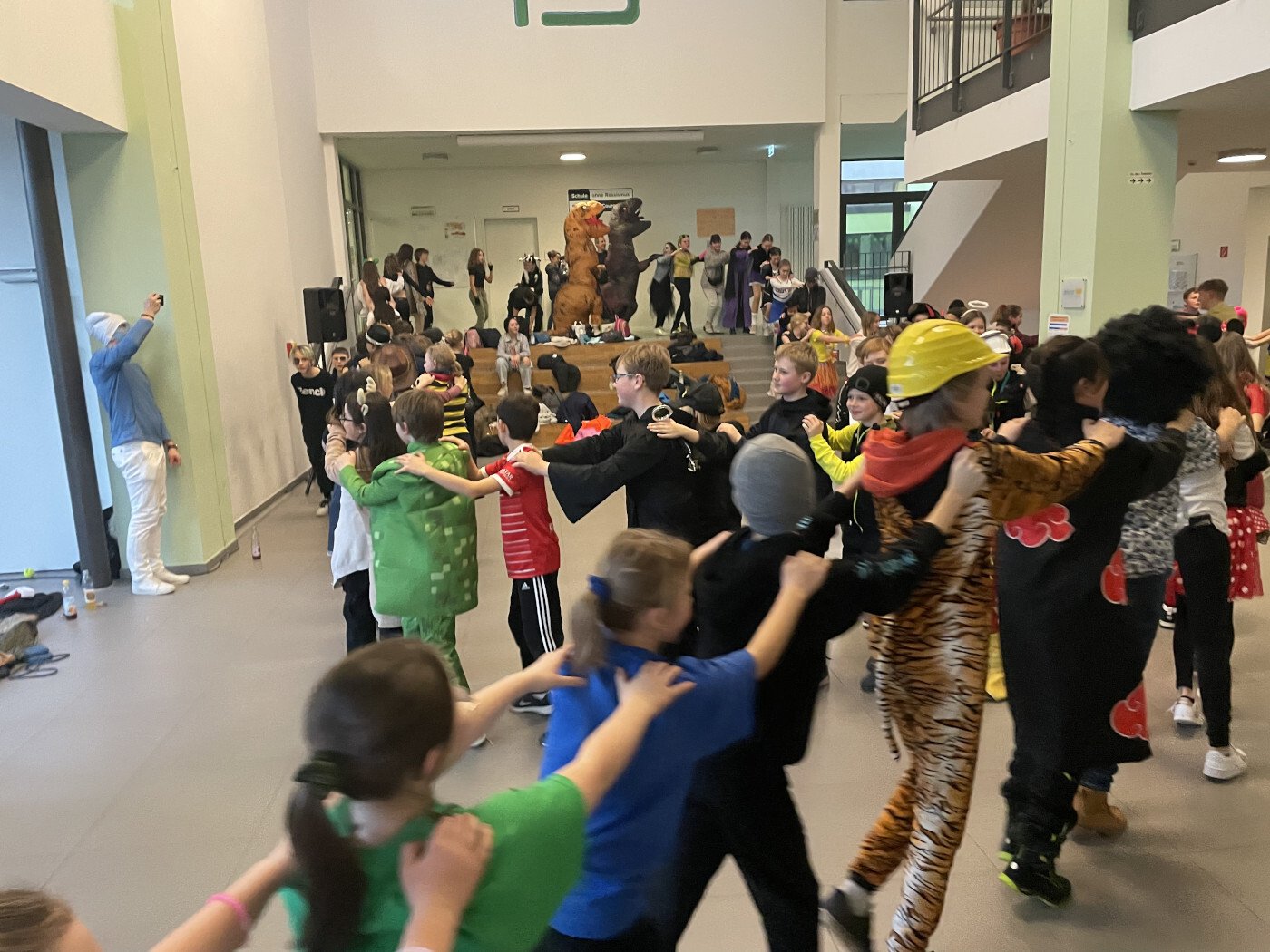 Nachdem am Mittwoch- und Donnerstagvormittag bereits Mottotage den Faschingsstart eingeleitet hatten, war es am Unsinnigen Donnerstag wieder so weit: die Schulfaschingsfeier der SMV für die fünften bis siebten Klassen stand auf dem Programm. Unter dem Motto „Alle, wie sie wollen“ trafen sich Schülerinnen, Schüler und Lehrkräfte am späten Nachmittag, um gemeinsam Fasching zu feiern. Die Klassen hatten im Vorfeld fleißig Aktionen vorbereitet: Limbo, Dosenwerfen, Rate- und Quizspiele, Reise nach Jerusalem, Kissenschlacht und sogar eine dunkle, gruselige Geisterbahn. Überall wuselten verkleidete Gestalten herum – es gab unter anderem überdimensionierte Dinosaurier, m&m’s, Ritter, Superhelden, Schlümpfe, Monster und noch viele andere fantasievolle Kostüme zu bewundern. Auch für Essen und Getränke war gesorgt. Für die musikalische Unterhaltung in der Aula waren Vitus und Korbi als DJs zuständig, die die Besucher auf die Tanzfläche brachten, während Hannes für einen reibungslosen Technikeinsatz sorgte. Auch eine Polonaise zog durch die Aula und zu weiteren Faschingsklassikern konnte ausgelassen getanzt und gesprungen werden. Die Zehntklässler Leo sowie Christof halfen den Jüngeren bei den Aktionen und prämierten schließlich die besten Kostüme.